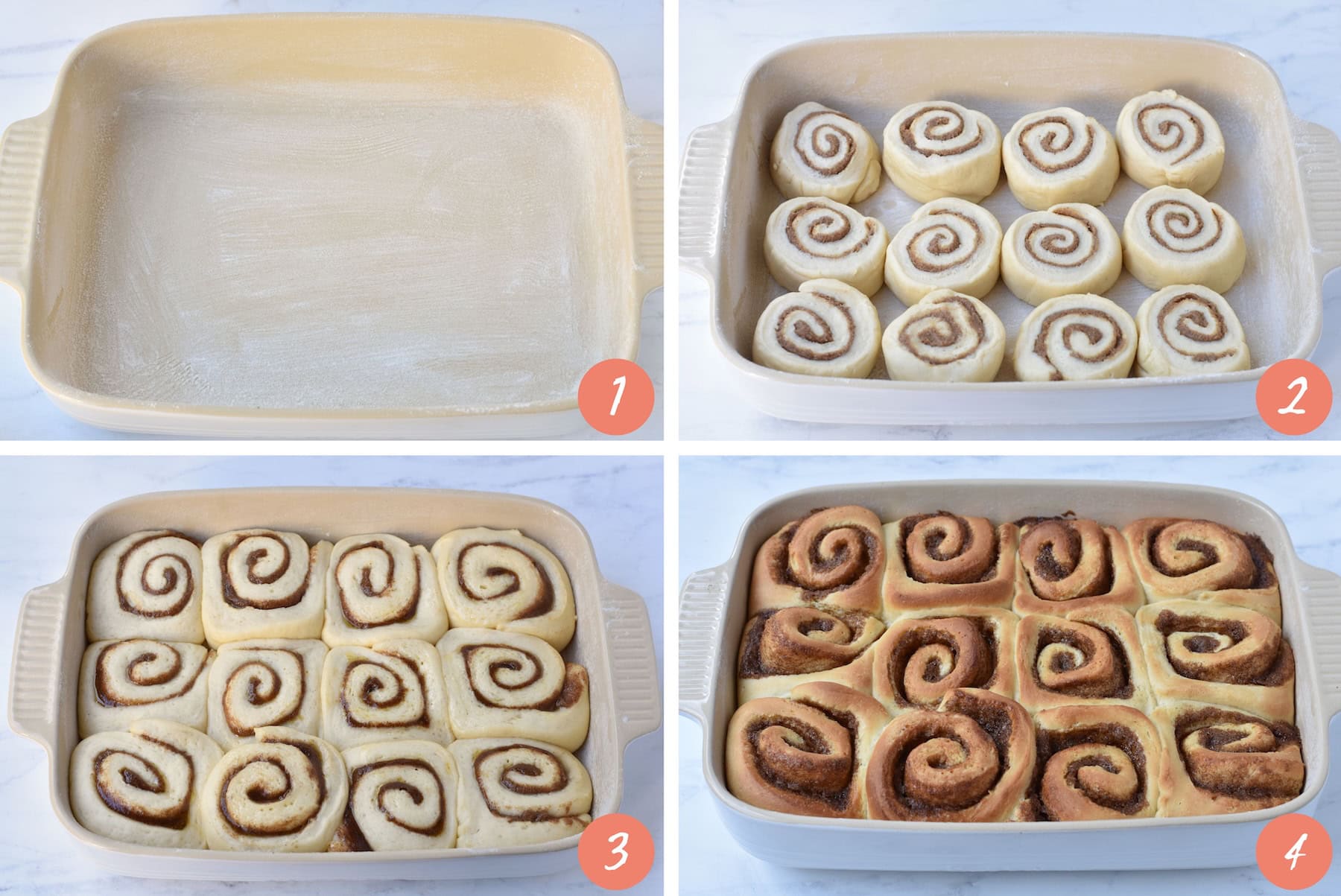 - Grease a large rectangular casserole dish (approx 24 x 30 cm / 9 x 12 inch) and dust lightly with flour, tapping out the excess. Place cinnamon rolls 3 x 4 in the baking dish.
