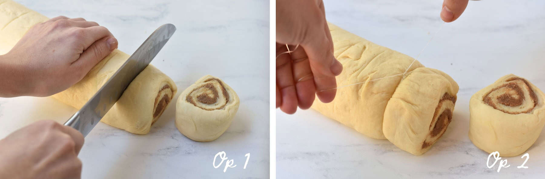 Op 2: Use unflavoured dental floss. Loop the floss around where you want to cut the roll then cross it over and pull so it slices through the dough.